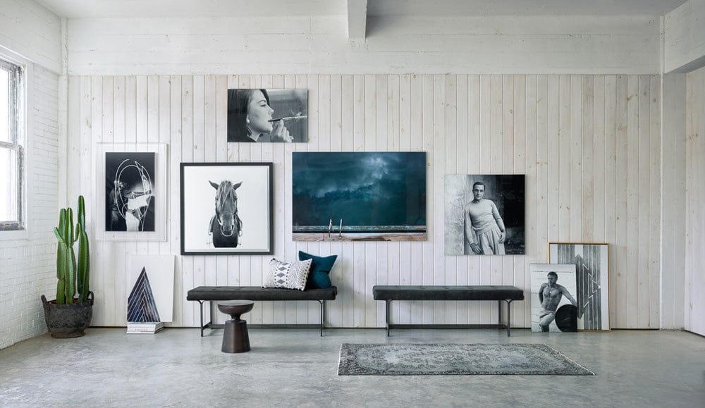 Simple and striking. A beautiful black-and-white capture of a beautiful horse, head on. Printed on top-quality photo paper and framed within black-finished American maple. Handmade in Austin, Texas.